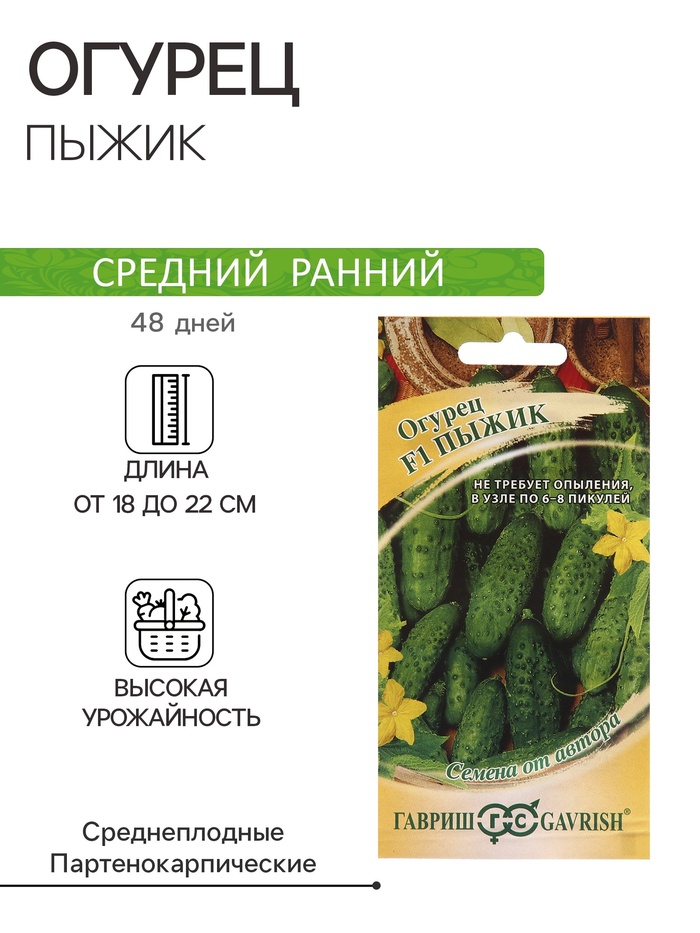 Новый скороспелый партенокарпический гибрид огурца (45-48 дней от всходов до плодоношения), женского типа цветения, предназначен для выращивания в пленочных теплицах. Растение сильнорослое, длина главного побега до 3,0-3,5 м. В узлах формируется по 2-4 завязи (до 6-8 штук). Зеленец длиной 10-12 см, диаметром 3,0-3,5 см, массой 90-110 г, бугорчатый. Окраска плода темно-зеленая со светлыми полосами, белошипый. Вкусовые качества плодов высокие, использование универсальное. Гибрид устойчив к корневым гнилям, настоящей мучнистой росе, вынослив к ложной мучнистой росе. Плотность посадки 2,5-3,0 раст/м2. Урожайность 5,0-7,0 кг/растение