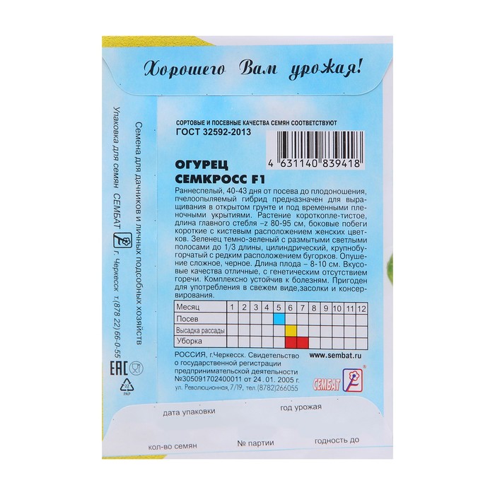 Гибрид среднеспелый, пчелоопыляемый. От всходов до начала плодоношения 44-48 дней. Плод цилиндрической формы, крупнобугорчатый, со сложным опушением, черношипый, генетически без горечи, зеленец длиной 8-10 см. Вкусовые качества свежих и консервированных плодов отличные. Гибрид устойчив к вирусу огуречной мозаики, мучнистой и ложной мучнистой росе. Плотность посадки 5-6 растений/м2. Урожайность 10-12 кг/м2.