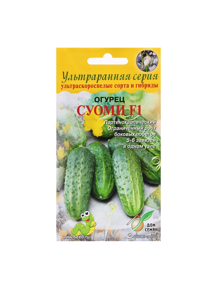 Суперраннеспелый - от всходов до первых сборов 38 дней, партенокарпический (не требует опыления) гибрид. Необычное сочетание мощной силы роста, характерной для всего растения в целом, с ограниченным ростом боковых побегов. Боковой побег формирует 3-4 междоузлия и заканчивается пучковой завязью, формирующей 5-6 плодов. Лист крупный, темно¬зеленый. Плод красивой овальной формы, длиной 5-6 см, диаметром 3,0-3,5 см, темно-зеленого цвета с размытыми белесыми полосами, доходящими до 1/3 длины плода. Сложнобугорчатый, расположение бугорков частое, окраска шипов черная. Кожица жесткая, плотная, мякоть сочная, хрустящая. Генетически свободен от горечи.