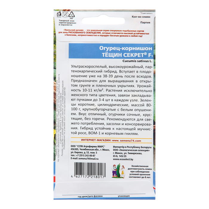 Ультраскороспелый, высокоурожайный, партенокарпический гибрид. Вступает в плодоношение уже на 38-39 день после всходов. Предназначен для выращивания в открытом грунте и плёночных укрытиях. Урожайность 10-11 кг/м2. Растения исключительно женского типа цветения, завязи закладывают пучками до 3-4 шт в каждом узле. Зеленцы короткие, цилиндрические, массой 80-100 г, крупнобугорчатые с белым опушением. Вкус отличный, огурчики сочные, хрустящие, без горечи.