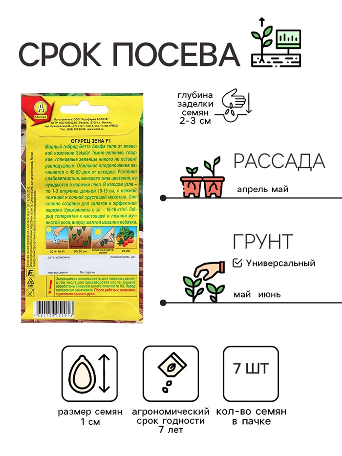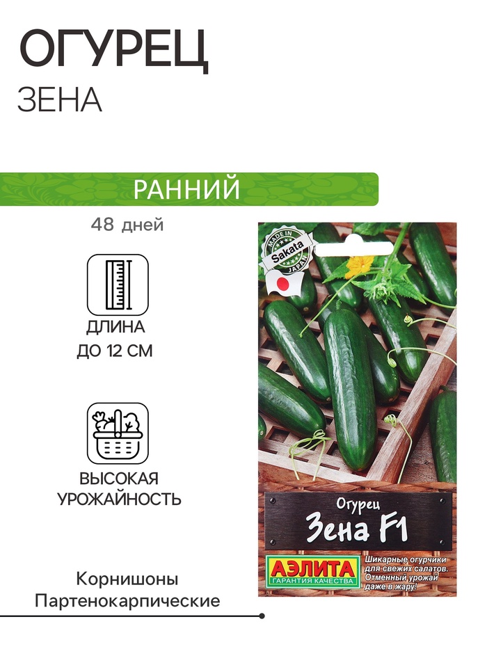 Модный гибрид Бетта Альфа типа от японской компании Sakata! Темно-зеленые, гладкие, глянцевые зеленцы никого не оставят равнодушным. Обильное плодоношение начинается с 45-50 дня от всходов. Растения слабоветвистые, женского типа цветения, не нуждаются в наличии пчел. В каждом узле – по 1-3 огурчика длиной 10-15 см, с нежной кожицей и сочной хрустящей мякотью. Они словно созданы для салатов и эффектной нарезки. Урожайность в з/г – 16-18 кг/м2. Гибрид толерантен к настоящей и ложной мучнистой росе, вирусу желтой мозаики кабачка.Запрещается использовать для пищевых целей, в том числе для производства масла. Семена обработаны Тирамом (класс опасности III). Перед посевом не замачивать. После работы с семенами тщательно вымыть руки.