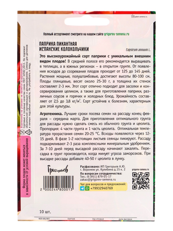 Семена Паприка пикантная Испанские Колокольчики 10 шт. 12.28 г.
