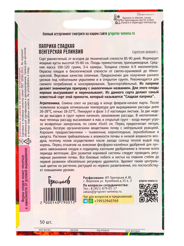 Семена Паприка сладкая Венгерская Реликвия 50 шт. 12.28 г.