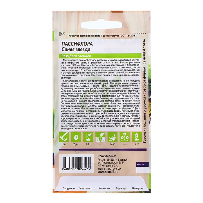 Многолетнее лианообразное растение с крупными яркими цветками, в открытом грунте выращивается как летник. Высота растения достигает 300 см. Цветки с бело-зелеными лепестками и фиолетово-синей короной, состоящей из утонченных волнистых ниточек, достигают в диаметре 10 см. Используют для декорирования приусадебных участков, озеленения заборов, балконов, стен строений, также в качестве комнатного растения. Светолюбивое растение, требует яркое освещение, не боится даже прямых (но не слишком палящих) лучей. Летом растение держат в тепле, около +25°С, зимой – около +15°С. Предпочитает влажную почву, поэтому поливать следует обильно, до нескольких раз в неделю по мере просыхания грунта. Семена требует скарификации – необходимо нарушить целостность оболочки, потерев ее наждачной бумагой. Затем семена на 2 дня замачивают в теплой воде. Для посева используют смесь дерна и садовой почвы. Семена раскладывают на субстрате, не присыпая, а немного вдавливая их в землю, а затем проводят полив. После посева контейнер накрывают плёнкой и ставят на рассеянный свет при температуре +22-24°С. Высокая влажность – основное условие прорастания. После появления всходов укрытие убирают. С формированием первых настоящих листьев пассифлоры пикируют в собственные горшки со свежим грунтом. Растение нуждается в периодическом опрыскивании. Не слишком требовательно к составу грунта и хорошо растёт практически в любой в меру тяжёлой и плодородной земле, имеющей реакцию от слабокислой до слабощелочной. Подкормки следует проводить на протяжении всего периода роста – с марта до сентября; зимой наступает период покоя. Растение нуждается в ежегодных пересадках. Цветение длится с весны до осени, образует плоды.