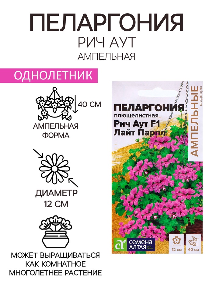 Сильно ветвящиеся побеги, образующие шаровидное растение диаметром 70-80 см. Непрерывное цветение постоянно возобновляющимися цветками. Короткие прочные цветоносы. Использование – подвесные кашпо, балконные ящики, смешанные контейнеры. Рекомендуется выращивать на хорошо освещенном месте. Совершенно новая ампельная пеларгония профессионального уровня, выращиваемая из семян. Легкое в выращивании, благодаря своей компактной форме и коротким междоузлиям. Не образует рыхлого растения с длинными хрупкими побегами, а формирует без обрезки очень плотный куст шаровидной формы. Обладает жесткими листьями и прочными побегами – что делает растение устойчивым к ветру и дождям. Цветение очень обильное – сотни постоянно возобновляющихся цветков.