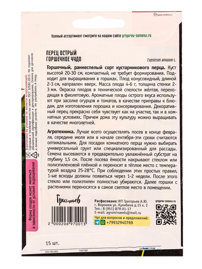 Семена Перец острый Горшечное Чудо 15шт. 12.29 г.