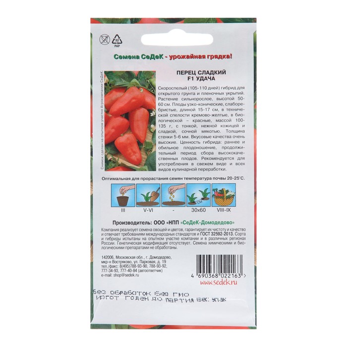 Скороспелый (105-110 дней) сорт для открытого грунта и пленочных укрытий. Растение сильнорослое, высотой 70-80 см. Плоды пониклые, конусовидные с острым кончиком, длиной 15-17 см, в технической спелости – светло-салатные, в биологической – красные, массой 100-135 г, сладкие, сочные. Толщина стенки 5-6 мм. Устойчив к болезням увядания. Отличается ранним и обильным плодоношением, продолжительным периодом сбора плодов. Очень высокие вкусовые качества плодов. Урожайность в открытом грунте.40-50 т/га. Урожайность в пленочных укрытиях 7-8 кг/м2
