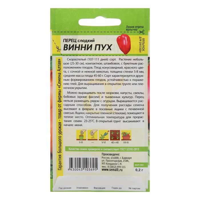 Скороспелый сорт (107-111 дней). Растение небольшое (25-30 см), компактное, штамбовое, с букетным расположением плодов. Плод конусовидный, красного цвета, с сочной и нежной мякотью, толщина стенки 5-8 мм, средняя масса плода 45-60 г. Сорт характеризуется дружным формированием плодов, устойчивостью к поражению тлей. Для выращивания в открытом грунте или пленочном укрытии. Предпочитает солнечные участки с легкими плодородными нейтральными почвами. Можно выращивать после моркови, капусты, свеклы, бобовых (кроме фасоли) и тыквенных культур. Перец нельзя размещать рядом с огурцом. Выращивается рассадным способом. Для получения рассады семена высевают в феврале в посевные ящики с почвенной смесью. Глубина заделки не более 1 см. Ящики, накрытые пленкой (стеклом), помещают в теплое место. Оптимальная температура для прорастания семян 23-25°С. В открытый грунт высаживают в начале июня. Посадочный интервал 40х40 см. Предпочитает нечастый обильный полив теплой водой. Хорошо отзывается на азотные подкормки.