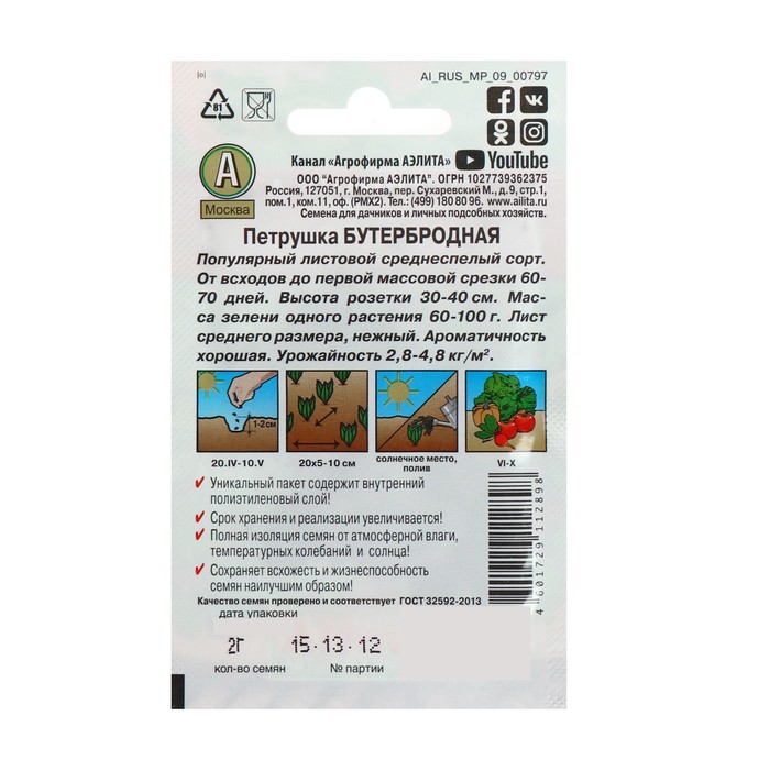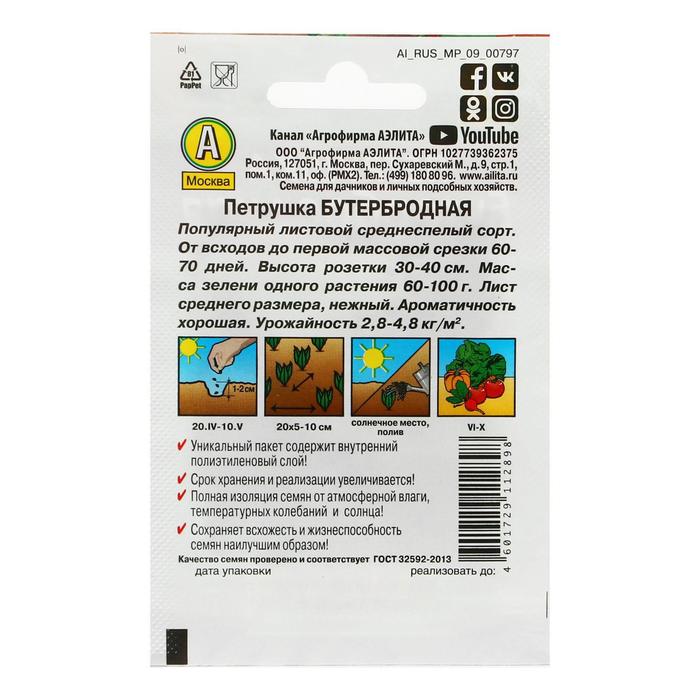 Благодаря внутреннему полиэтиленовому слою пакет не пропускает влагу и увеличивает срок годности семян до 2 лет.