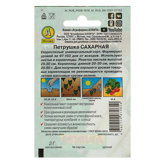 Благодаря внутреннему полиэтиленовому слою пакет не пропускает влагу и увеличивает срок годности семян до 2 лет.