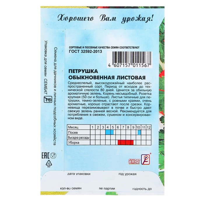 Семена петрушки высевают в несколько сроков. Весной семена высевают в конце апреля-начале мая, под зиму в октябре-ноябре, летом - в конце июня. Под зиму семена высевают сухими. Весной семена петрушки сеют в увлажненные бороздки. Между растениями выдерживают расстояние в 3-4 сантиметра, между рядками соблюдают расстояние в 20-30 сантиметров. Сверху посевы мульчируют торфом. Посевы укрывают для быстрого прорастания семян. Пленку убирают при появлении первых всходов. Петрушку необходимо прореживать, пропалывать и поливать. Уборку листьев производят периодически, по мере необходимости.
