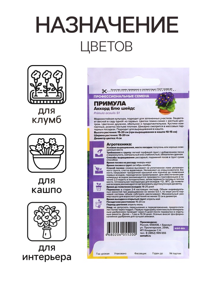 Морозостойкий травянистый двулетник среднераннего срока цветения. Идеально подходит для выращивания в горшечной культуре. Высота растения в горшке 10-15 см, в открытом грунте – 15-20 см. Ширина кустика 15-20 см. Розетка продолговатых светло-зеленых морщинистых листьев служит великолепным фоном. Очаровательные цветки достаточно крупные, в диаметре около 4 см. Групповые посадки из примул отлично смотрятся на каменистых горках, в бордюрах, миксбордерах и рабатках. Эффектно выглядят под деревьями и кустарниками.