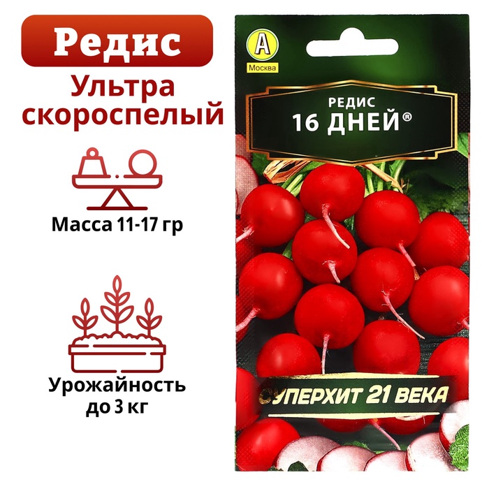 «16 дней» представляет собой ультраскороспелый высокоурожайный сорт редиса, устойчивый к растрескиванию и стрелкованию. Предназначен для открытого и защищённого грунта. Растение имеет выравненные ярко-красные плоды округлой формы со слабоострым вкусом.