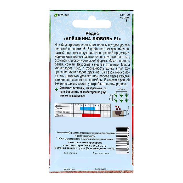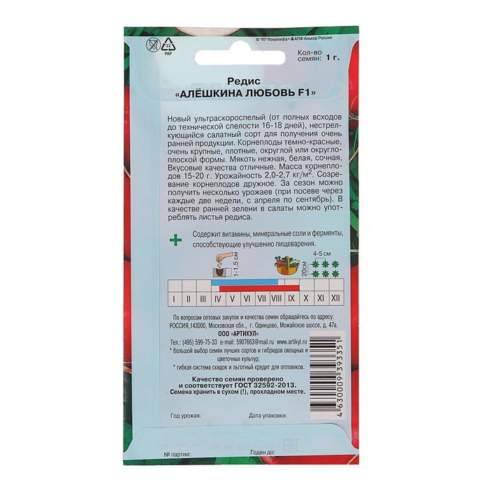 Новый ультраскороспелый (от полных всходов до технической спелости 16-18 дней), нестрелкующийся салатный сорт для получения очень ранней продукции. Корнеплоды темно-красные, очень крупные, плотные, округлой или округло-плоской формы. Мякоть нежная, белая, сочная, Вкусовые качества отличные. Масса корнеплодов 15-20 г. Урожайность 2,0-2,7 кг/м2. Созревание корнеплодов дружное. За сезон можно получить несколько урожаев (при посеве через каждые две недели, с апреля по сентябрь). В качестве ранней зелени в салаты можно употреблять листья редиса.
