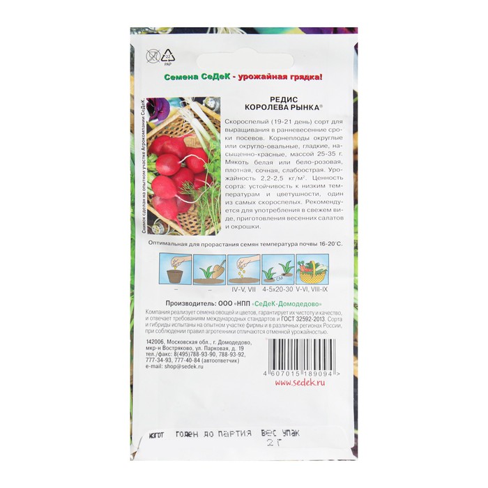 Скороспелый (19-21 день) сорт для выращивания в ранневесенние сроки посевов. Корнеплоды округлые или округло-овальные, гладкие, насыщенно красные, массой 25-35 г. Мякоть белая или бело-розовая, плотная, сочная, слабоострая. Урожайность 2,2-25) кг/м”. Ценность сорта: устойчивость к низким температурам и цветушности, один из самых скороспелых. Рекомендуется для употребления в свежем виде, приготовления весенних салатов и окрошки.