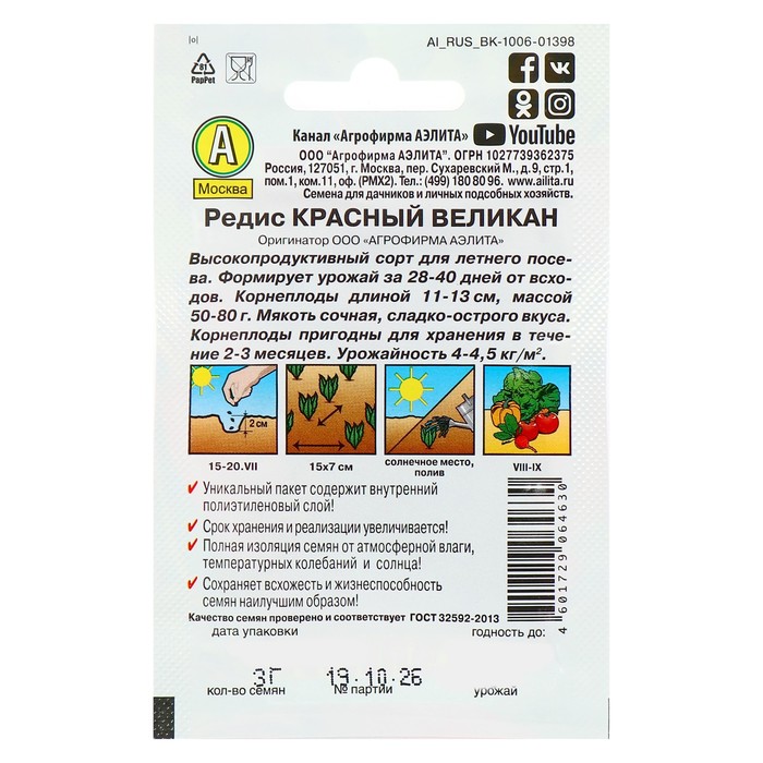 Среднеспелый сорт: период от полных всходов до созревания — 26–35 дней. Корнеплод удлинённо-цилиндрический длиной 12–13 см, красный с бело-розовой поперечной бороздчатостью. Мякоть белая, сочная, сладко-острого вкуса. Корнеплоды слегка приподняты над поверхностью почвы, крупные, массой 45–80 г. Вкусовые качества отличные. Сорт холодостойкий, устойчив к цветушности. Корнеплоды отличаются хорошей лёжкостью.