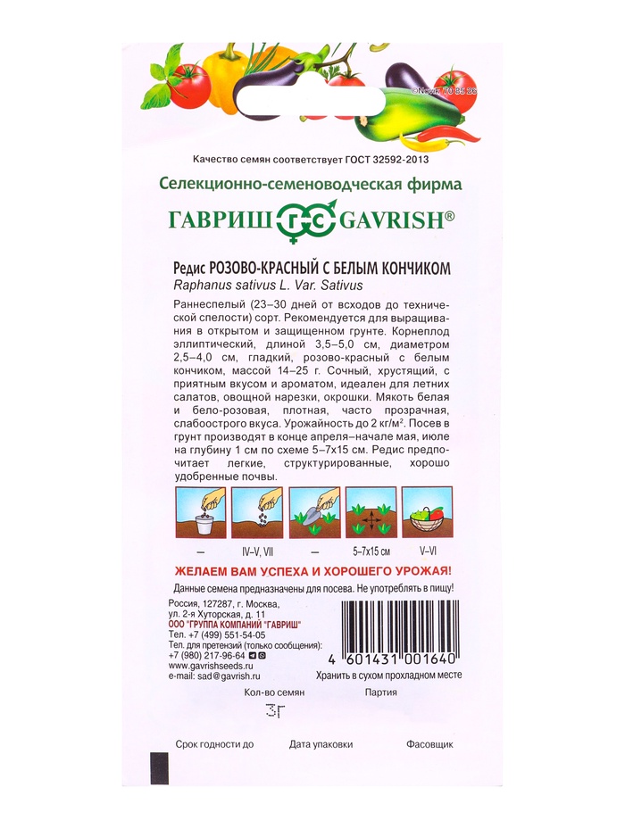 Семена Редис Розово-красный с белым кончиком 3 г