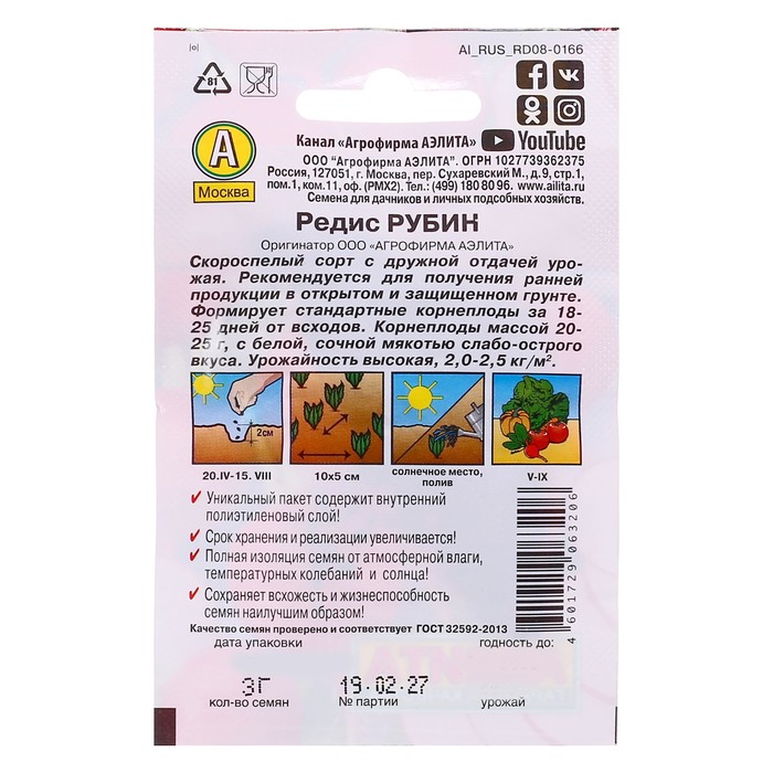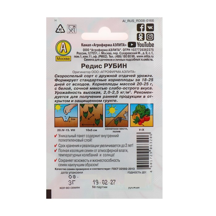 Скороспелый, высокоурожайный сорт образует стандартный корнеплод через 24–31 день после появления всходов. Корнеплоды округлой формы, диаметром 2,5–5,0 см, с гладкой поверхностью тёмно-красного цвета, массой 10–30 г. Мякоть белая, сочная, слабоострого вкуса.