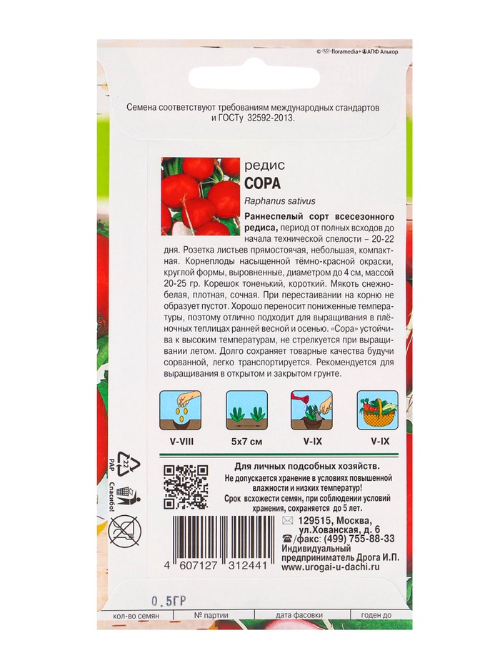 Раннеспелый сорт всесезонного редиса, период от полных всходов до начала технической спелости – 20-22 дня. Розетка листьев прямостоячая, небольшая, компактная. Корнеплоды насыщенной тёмно-красной окраски, круглой формы, выровненные, диаметром до 4 см, массой 20-25 гр. Корешок тоненький, короткий. Мякоть снежно-белая, плотная, сочная. При перестаивании на корню не образует пустот. Хорошо переносит пониженные температуры, поэтому отлично подходит для выращивания в плёночных теплицах ранней весной и осенью. «Сора» устойчива к высоким температурам, не стрелкуется при выращивании летом. Долго сохраняет товарные качества будучи сорванной, легко транспортируется. Рекомендуется для выращивания в открытом и закрытом грунте.