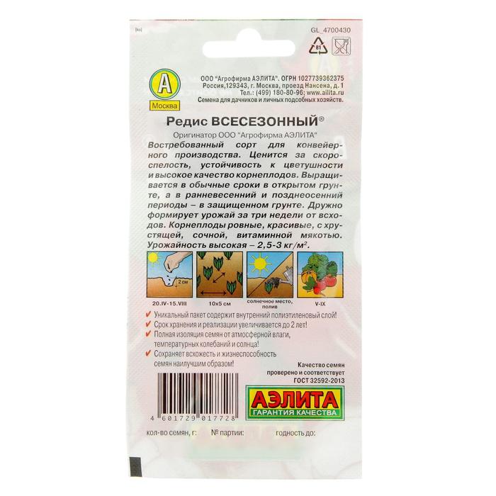 «Всесезонный» — раннеспелый, высокоурожайный сорт редиса. Предназначен для выращивания с весны до осени в открытом грунте. Растение формирует округлые корнеплоды ярко-красного цвета с нежной, сочной мякотью. Сорт устойчив к цветушности.