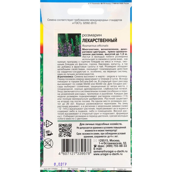 Многолетнее, вечнозеленое, декоративно-цветущее, пряно-ароматическое растение, высотой до 1,0 м. Листья и молодые побеги розмарина используют в свежем и сухом виде, как пряную приправу к горячим блюдам из мяса и птицы, овощным блюдам из фасоли, гороха, баклажан, капусты, а так же добавка в фруктовые салаты и чай. Розмарин обладает целебными свойствами, оказывает тонизирующее действие на сердечно-сосудистую и, особенно, на нервную систему, один из лучших антиоксидантов.