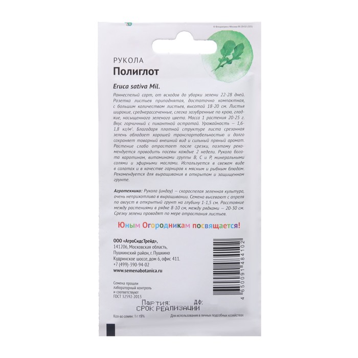 Благодаря плотной структуре листа срезанная зелень обладает хорошей транспортабель- ностью и долго сохраняет товарный внешний вид и сильный пряный аромат, растение слабо отрастает после срезки. поэтому рекомендуется проводить посевы каждые 2 недели. Рукола богата каротином, витаминами группы В, С и Р. минеральными солями и эфирными маслами. Используется в свежем виде в салатах и в качестве гарниров к мясным. и рыбным блюдам. Рекомендуется для выращивония в открытом и защищенном грунте.