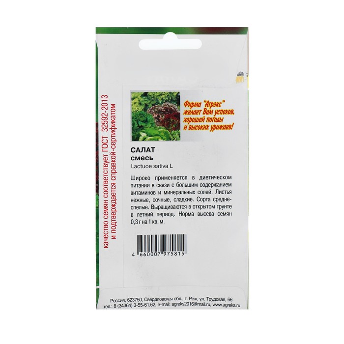 Смесь включает в себя несколько разнотипных сортов салата, как листовых, так и кочанных, с различной формой листа и окраской от светло-зеленой до темно-красной. Листья салата содержат много каротина и минералов - имеют самое большое, среди овощных культур, содержание кальция. Салат способствует регулированию обмена веществ, применяется при лечении заболеваний органов пищеварения и способствует выведению из организма холестерина. Высевается салат в несколько сроков – с ранней весны и до осени, может выращиваться как в открытом грунте, так и в защищенном.