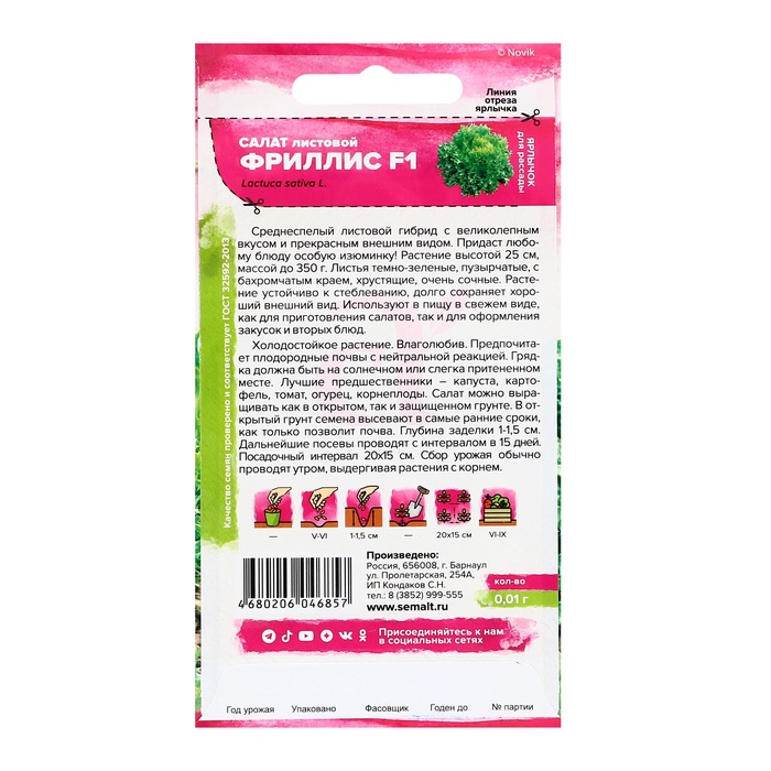 Среднеспелый листовой сорт с великолепным вкусом и прекрасным внешним видом. Придаст любому блюду особую изюминку! Растение высотой 25 см, массой до 350 г. Листья темно-зеленые, пузырчатые, сильноволнистые по краю, являются прекрасным украшением. Листья хрустящие, очень сочные. Растение устойчиво к стеблеванию, долго сохраняет хороший внешний вид. Используют в пищу в свежем виде, как для приготовления салатов, так и для оформления закусок и вторых блюд. Холодостойкое растение. Влаголюбив. Предпочитает плодородные почвы с нейтральной реакцией. Грядка должна быть на солнечном или слегка притененном месте. Лучшие предшественники — капуста, картофель, томат, огурец, корнеплоды. Салат можно выращивать как в открытом, так и защищенном грунте. В открытый грунт семена высевают в самые ранние сроки, как только позволит почва. Глубина заделки 1-1,5 см. Дальнейшие посевы проводят с интервалом в 15 дней. Посадочный интервал 20х15 см. Сбор урожая обычно проводят утром, выдергивая растения с корнем.