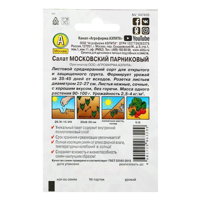 «Московский парниковый» — это листовой скороспелый сорт салата, у которого период от всходов до сбора урожая длится 35–40 дней. Он, устойчив к холоду и цветушности, а также отличается великолепными вкусовыми качествами.