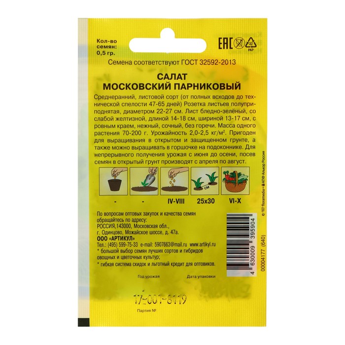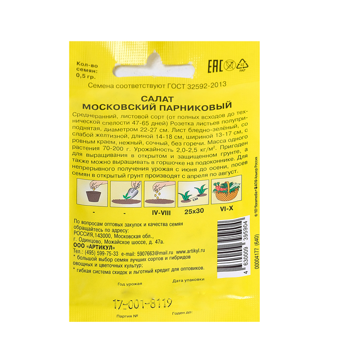 Среднеранний, листовой сорт (от полных всходов до технической спелости 47-65 дней) Розетка листьев полуприподнятая, диаметром 22-27 см. Лист бледно-зелёный, со слабой желтизной, длиной 14-18 см, шириной 13-17 см, с ровным краем, нежный, сочный, без горечи. Масса одного растения 70-200 г. Урожайность 2,0-2,5 кг/м2. Пригоден для выращивания в открытом и защищенном грунте, а также можно выращивать в горшочке на подоконнике. Для непрерывного получения урожая с июня до осени, посев семян в открытый грунт производят с апреля по август.