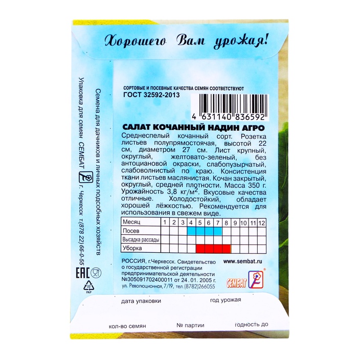 Кочанный среднеспелый сорт. Период от всходов до уборки урожая 55-60 дня. Розетка листьев полупрямостоячая, высотой 22 см, диаметром 27 см. Лист крупный, округлый, желтовато-зеленый, без антоциановой окраски, слабопузырчатый, слабоволнистый по краю. Кочан закрытый, округлый, средней плотности. Масса кочана 350 г. Консистенция ткани листьев маслянистая. Вкусовые качества отличные. Ценность сорта: холодостойкий сорт, обладает хорошей лежкостью и устойчивостью к стрелкованию. Рекомендуется для использования в свежем виде.