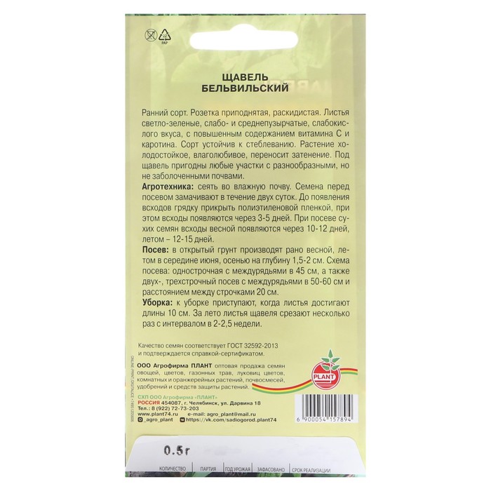 Стойкий к стеблеванию щавель из раннеспелых. Среднеподнятая, раскидистая розетка. Форма листочков яйцевидная, край ровный или слабоволнистый, слабо- или среднепузырчатые. Окрас светлозеленый. Размер пластинки от 13 до 15 мм, шириной от 5 до 10 см, продолжительность черешка от 12 до 21 см. Сорт отличается большим содержанием каротиноидов и витамина С. Хорошо подходит и для употребления в свежем виде, и для заготовок впрок. Вкус резкий, ярковыраженный.