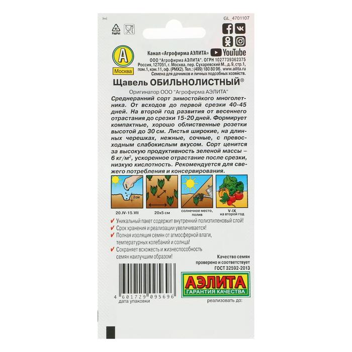 Щавель «Обильнолистный» — среднеранний сорт зимостойкого многолетника. Растение формирует компактную, прямостоячую, хорошо облиственную розетку высотой до 20 см. Листья щавеля богаты витаминами и микроэлементами, полезной клетчаткой и органическими кислотами.