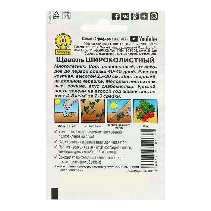«Широколистный» представляет собой многолетний раннеспелый сорт щавеля. Растения имеют крупную розетку. Листья на длинных корешках нежные и сочные, обладают слабокислым вкусом.