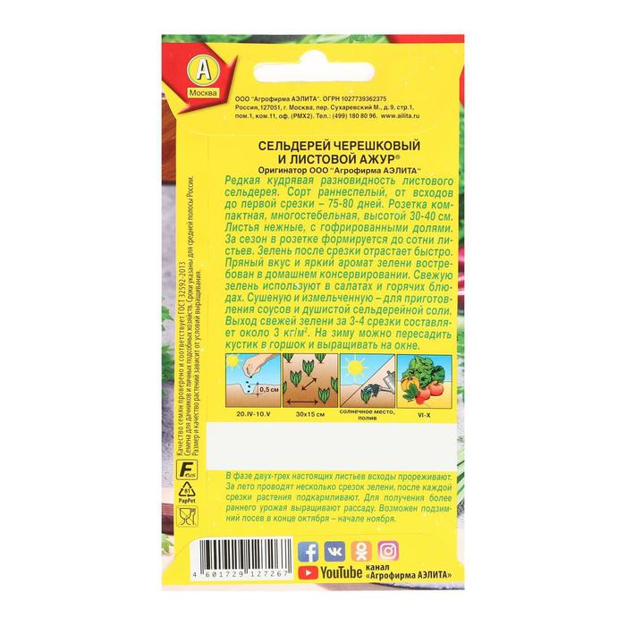 Кудрявая разновидность листового сельдерея. Сорт раннеспелый, от всходов до первой срезки – 75-80 дней. Розетка компактная, многостебельная, высотой 30- 40 см. Лист нежный, с гофрированными долями. За сезон в розетке формируется до сотни листьев. Зелень после срезки отрастает быстро. Пряный вкус и крепкий аромат зелени востребован в домашнем консервировании. Свежую зелень используют в салатах и горячих блюдах. Сушеную и измельченную – для приготовления соусов и душистой сельдерейной соли. Выход свежей зелени за 3-4 срезки составляет около 3 кг/м 2 . На зиму можно пересадить кустик в горшок и выращивать на окне.