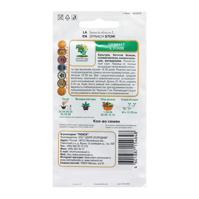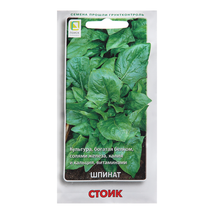 Шпинат Стоик - культура, богатая белком, солями железа, калия и кальция, витаминами. Культура, богатая белком, солями железа, калия и кальция, витаминами. Раннеспелый сорт. Период от полных всходов до технической спелости при весеннем посеве 15-20 дней. Розетка листьев полуприподнятая, сомкнутая или промежуточная, диаметром 13-30 см. Лист среднечерешковый, средней величины, овальный и широкоовальный, остроконечный и копьевидный, зеленый. Длина 10-19 см, ширина 5-14 см. Край листа ровный или слабовыемчатый, поверхность слабоморщинистая, при подзимнем посеве - сильноморщинистая. Черешок 7 см. Рекомендуется для использования в свежем виде и консервирования.