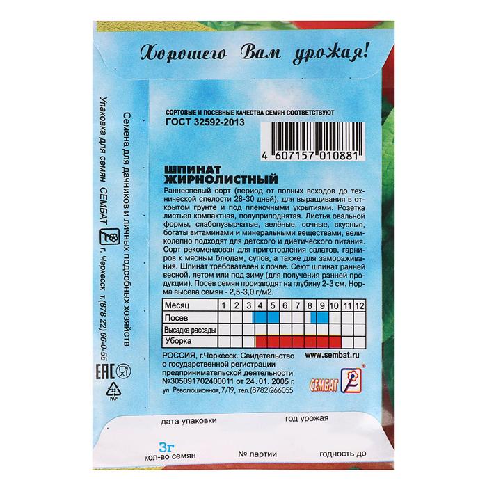 В южных регионах высевают семена в открытый грунт апреле, севернее – в мае, когда минует опасность заморозков. Норма высева — 0,5-0,6 г/м2. Семена заделывают на глубину около 2-3 см. Всходы появляются в среднем через две-три недели после посева. Чтобы ускорить прорастание семян, их замачивают в воде перед посевом, меняя ее 2-3 раза, время замачивания не менее суток. Проводят прореживания. С появлением всходов растения прореживают на 5-7 см одно от другого, 3-4-го листа — на 15-20 см. Шпинат теплолюбивое растение, предпочитающее хорошо освещенные солнцем участки, не переносящее тяжелые почвы. Лучше всего удается на достаточно плодородных среднесуглинистых или легких почвах. Требует регулярного полива. Для растения характерен не ослабляющийся рост вегетативной массы во время цветения. Уборку проводят выборочно, многократно, до начала цветения. Высокие летние температуры заставляют растение идти в стрелку, поэтому повторный посев рекомендуем только в начале августа. Требователен к влаге и почвенному плодородию.