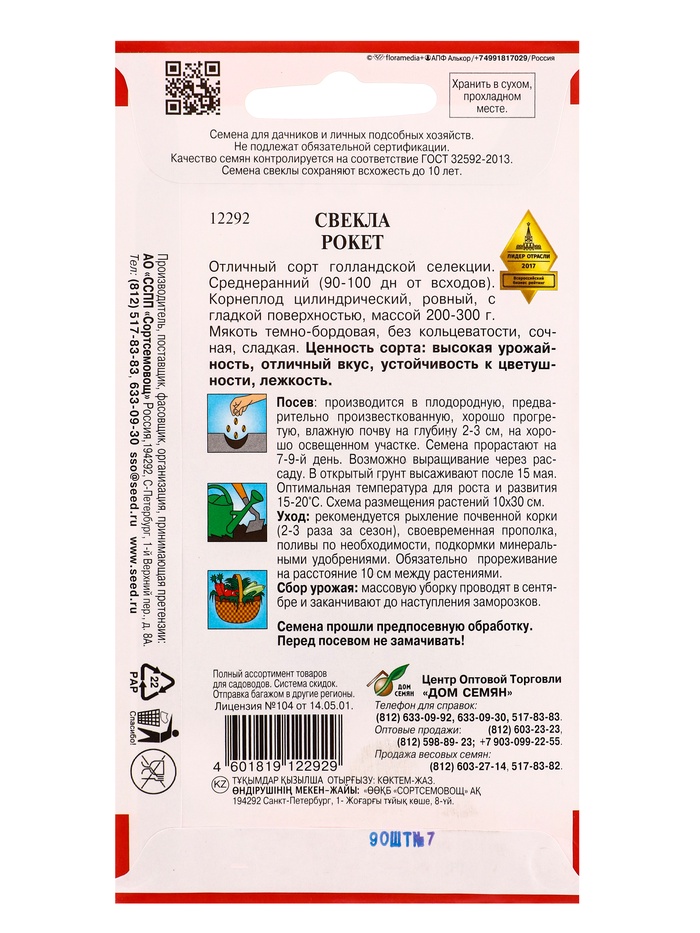 Отличный сорт голландской селекции. Среднеспелый (110-120 дн. от всх.) сорт голландской селекции. Корнеплод цилиндрический, ровный, с гладкой поверхностью, массой 200-300 г. Мякоть темно-бордовая, без кольцеватости, сочная, сладкая. Ценность сорта: высокая урожайность, отличный вкус, устойчивость к цветушности. Для свежего потребления, переработки и длительного хранения.Посев: производится в плодородную, предварительно произвесткованную, хорошо прогретую почву на глубину 2-3 см , на хорошо освещенном участке. Возможно выращивание через рассаду. В открытый грунт высаживают после 15 мая. Растения размещают по схеме 10х30 см. Перед посевом не замачивать!Уход: рекомендуется рыхление почвенной корки (2-3 раза за сезон) , своевременная прополка, поливы по необходимости, подкормки минеральными удобрениями. Обязательно прореживание на расстояние 10 см между растениями. Сбор урожая: масовую уборку проводят в сентябре и заканчивают до наступления заморозков.