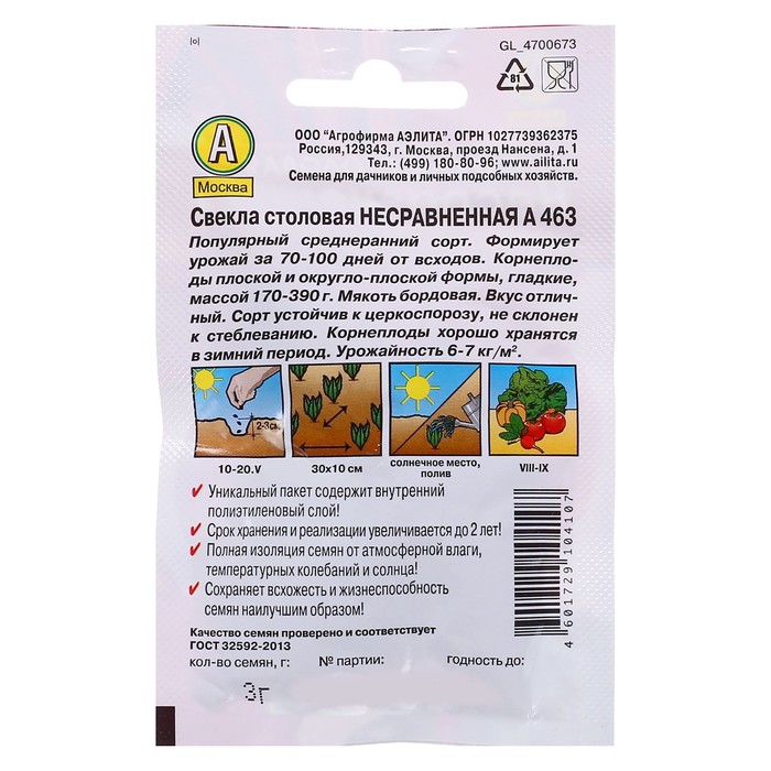 Посев: в открытый грунт на глубину 2 см. Прореживайте всходы обычно в 2 приёма: с развитием первых двух пар настоящих листочков и когда корнеплоды достигнут диаметра 2–3 см. Осуществляйте регулярные поливы, прополки, рыхления и подкормки.