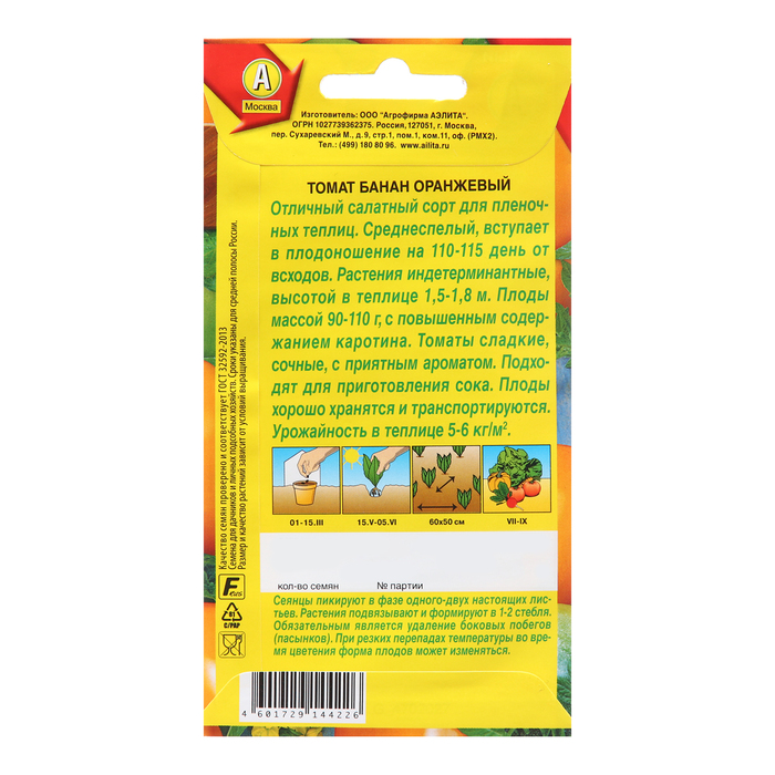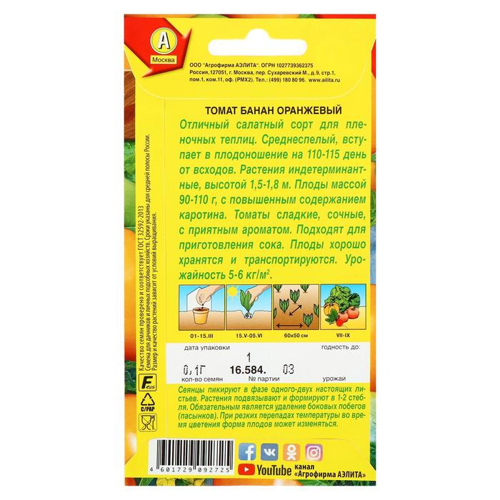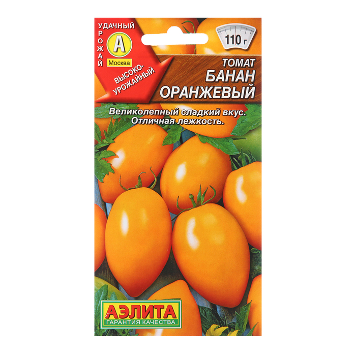 «Банан оранжевый» — среднеспелый высокоурожайный сорт для плёночных теплиц. Растение формирует цилиндрические, гладкие, янтарно-оранжевые плоды с высоким содержанием ликопина — мощного природного антиоксиданта. Сорт устойчив к фузариозу и кладоспориозу.
