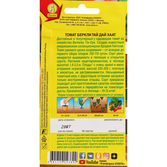 Достойный и популярный у садоводов томат из семейства Berkeley Tie-Dye. Создан известным американским селекционером Брэдом Гейтсом. Томат раннего срока созревания – от всходов до первого сбора плодов 105-110 суток. Сорт рекомендуется выращивать в теплицах и открытом грунте. Растение индетерминантное, в теплице высотой 1,8-2,0 м. Плоды* с очень яркой и неповторимой окраской, массой 250-300 г, плотные и мясистые, не растрескиваются. Насыщенный томатный вкус с фруктовым оттенком заслужил только восторженные отзывы. Сорт прекрасно подходит для приготовления салатов, консервирования, вяления и переработки на томатопродукты. Урожайность в теплице – 10-12 кг/м2.