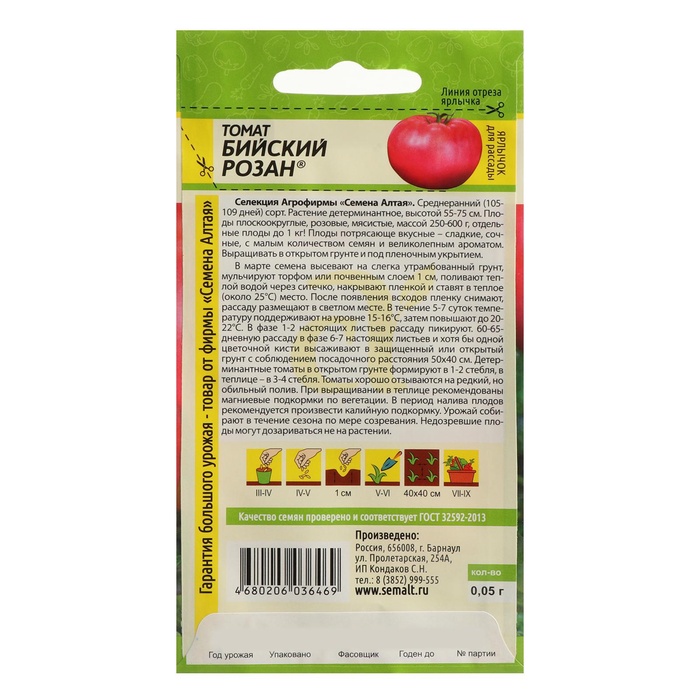 Селекция Агрофирмы «Семена Алтая». Среднеранний (105-109 дней) сорт. Растение детерминантное, высотой 55-75 см. Плоды плоскоокруглые, розовые, мясистые, массой 250-600 г, отдельные плоды до 1кг! Плоды потрясающе вкусные - сладкие, сочные, с малым количеством семян и великолепным ароматом. Выращивать в открытом грунте и под пленочным укрытием. В марте семена высевают на слегка утрамбованный грунт, мульчируют торфом или почвенным слоем 1 см, поливают теплой водой через ситечко, накрывают пленкой и ставят в теплое (около 25°С) место. После появления всходов пленку снимают, рассаду размещают в светлом месте. В течение 5-7 суток температуру поддерживают на уровне 15-16°С, затем повышают до 20-22°С. В фазе 1-2 настоящих листьев рассаду пикируют. 60-65-дневную рассаду в фазе 6-7 настоящих листьев и хотя бы одной цветочной кисти высаживают в защищенный или открытый грунт с соблюдением посадочного расстояния 40х40 см. Детерминантные томаты в открытом грунте формируют в 1-2 стебля, в теплице – в 3-4 стебля. Томаты хорошо отзываются на редкий, но обильный полив. При выращивании в теплице рекомендованы магниевые подкормки по вегетации. В период налива плодов рекомендуется произвести калийную подкормку. Урожай собирают в течение сезона по мере созревания. Недозревшие плоды могут дозариваться не на растении.