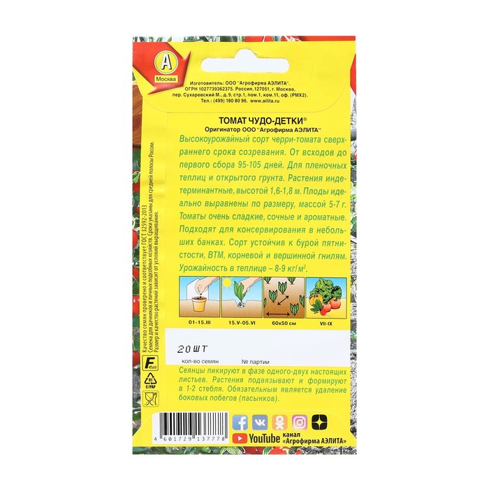 Высокоурожайный сорт черри-томата сверх раннего срока созревания. От всходов до первого сбора 95-105 дней. Для пленочных теплиц и о/г. Растения индетерминантные, высотой 1,6-1,8 м. Плоды массой 5-7 г, очень сладкие, сочные и ароматные. Подходят для консервирования в небольших банках. Урожайность – 8-9 кг/м2. Сорт устойчив к бурой пятнистости, ВТМ, МР, корневой и вершинной гнилям.