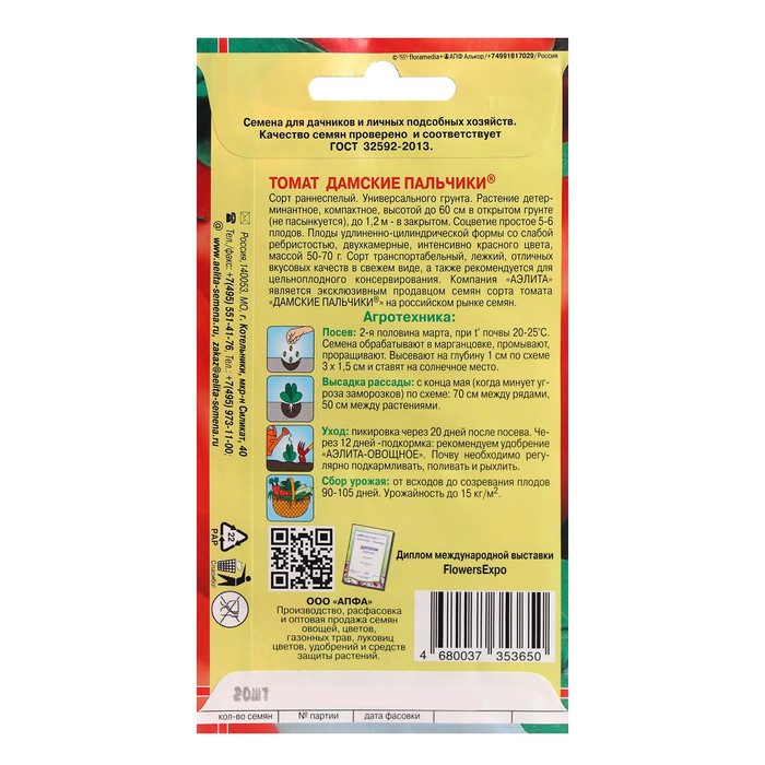Сорт раннеспелый. Универсального грунта. Растение детерминантное, компактное, высотой до 60 см в открытом грунте (не пасынкуется), до 1,2 м в закрытом. Соцветие простое 5-6 плодов. Плоды удлиненно-цилиндрической