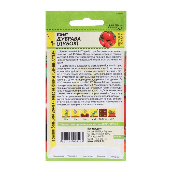 Раннеспелый (85-105 дней) сорт. Растение детерминантное, высотой 40-60 см. Плоды округлые, красные, гладкие, массой 53-110 г, отличного вкуса, с повышенным содержанием витаминов и полезных биологически активных веществ. В марте семена высевают на слегка утрамбованный грунт, мульчируют торфом или почвенным слоем 1 см, поливают теплой водой через ситечко, накрывают пленкой и ставят в теплое (около 25°С) место. После появления всходов пленку снимают, рассаду размещают в светлом месте. В течение 5-7 суток температуру поддерживают на уровне 15-16°С, затем повышают до 20-22°С. В фазе 1-2 настоящих листьев рассаду пикируют. 60-65-дневную рассаду в фазе 6-7 настоящих листьев и хотя бы одной цветочной кисти высаживают в защищенный или открытый грунт с соблюдением посадочного расстояния 40х40 см. Детерминантные томаты в открытом грунте формируют в 1-2 стебля, в теплице – в 3-4 стебля. Томаты хорошо отзываются на редкий, но обильный полив. При выращивании в теплице рекомендованы магниевые подкормки по вегетации. В период налива плодов рекомендуется произвести калийную подкормку. Урожай собирают в течение сезона по мере созревания. Недозревшие плоды могут дозариваться не на растении.