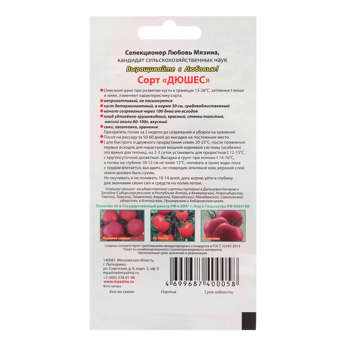 Сорт среднеранний (110-115 дней от массовых всходов до начала плодоношения).Предназначен для выращивания в открытом грунте, временных плёночных укрытиях, в теплицах.Возраст рассады для высадки на постоянное место должен иметь 50-55 дней.Растение среднеоблиственное, в открытом грунте высотой 50-70 см, можно не пасынковать.Плоды удлинённо-грушевидные, массой до 90 г, красные, с нежной мякотью, не грубой кожицей, сладкие, ароматные, легко дозариваются.При соблюдении агротехники урожайность с куста должна быть 3,5-4 кг.Схема посадки растений между растениями - 40 см, в междурядье 70 см.Отличается повышенной устойчивостью к воздушной и почвенной засухе, альтернариозу, септориозу, антракнозу плодов.Предназначен для свежего потребления, изготовления кетчупов, лечо, цельноплодного консервирования.Проходил государственное сортоиспытание в Дальневосточном и Западно-Сибирском регионе: в Республике Алтай, в Кемеровской, Новосибирской, Омской, Томской, Тюменской, Амурской, Камчатской, Магаданской, Сахалинской областях, в Алтайском, Приморском и Хабаровском краях.