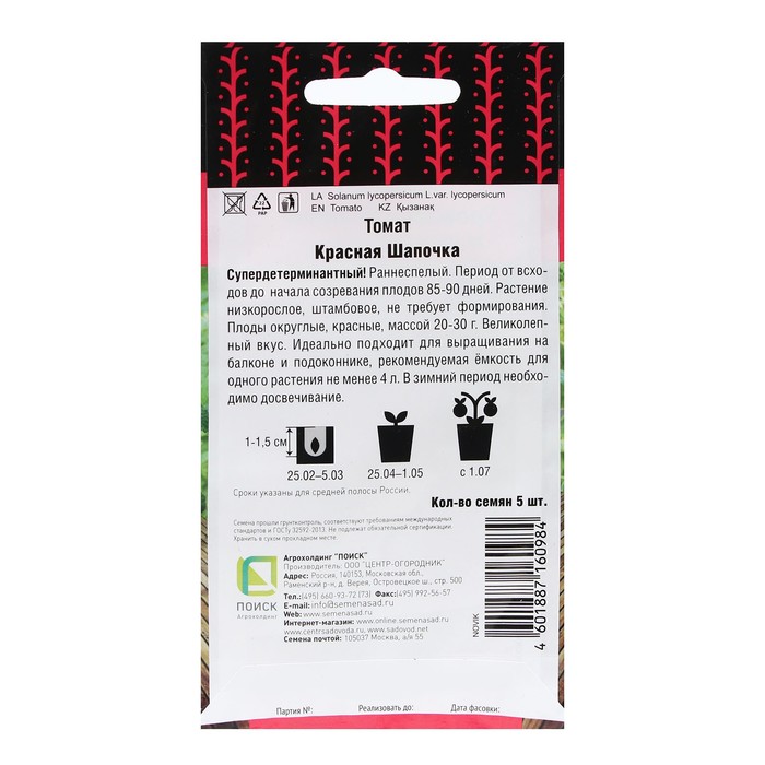Супердетерминантный! Раннеспелый. Период от всходов до начала созревания плодов 85-90 дней. Растение низкорослое, штамбовое, не требует формирования. Плоды округлые, красные, массой 20-30 г. Великолепный вкус. Идеально подходит для выращивания на балконе и подоконнике, рекомендуемая ёмкость для одного растения не менее 4л. В зимний период необходимо досвечивание.