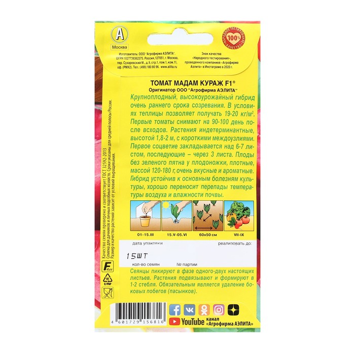 Посев на рассаду – в начале марта. Пикировка в фазе 1-2-х настоящих листьев.Растения подвязывают и формируют в 1-2 стебля. Обязательным является удаление боковых побегов (пасынков). Посадка рассады – в середине мая под пленку, в начале июня - в открытый грунт. Возраст рассады –60-65 дней (в фазе пяти-семи настоящих листьев). Схема посадки 60х50 см.