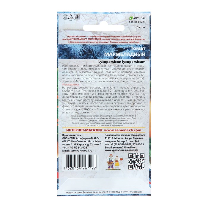 Агротехника: на рассаду семена высевают в марте - начале апреля, на глубину 1 см. Пикировка в фазе 1-2 настоящих листьев. Рассаду подкармливают 2-3 раза полным удобрением. За 7-10 дней перед высадкой рассаду начинают закалять. В теплицы 60-65-дневную рассаду высаживают в апреле - мае, в открытый грунт в -июне, после окончания весенних заморозков, в фазе 6-7 настоящих листьев и хотя бы‚ одной цветочной кисти, Схема посадки: 30х50 см. Томаты нуждаются в регулярных поливах и подкормках.