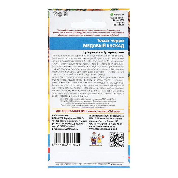 Раннеспелый, высокоурожайный, индетерминантный сорт, который является разновидностью черри. Плоды – ярко-желтые маленькие помидорки массой 20-30 г, растущие до 15 шт. на одной кисти. Плоды грушевидной формы также напоминают капельку, при этом свисают массивными каскадами, что и определило название сорта. А приставка «медовый» в названии обусловлена необычайно сладким для помидоров вкусом — считается, что этот сорт — самый сладкий среди всех томатов.